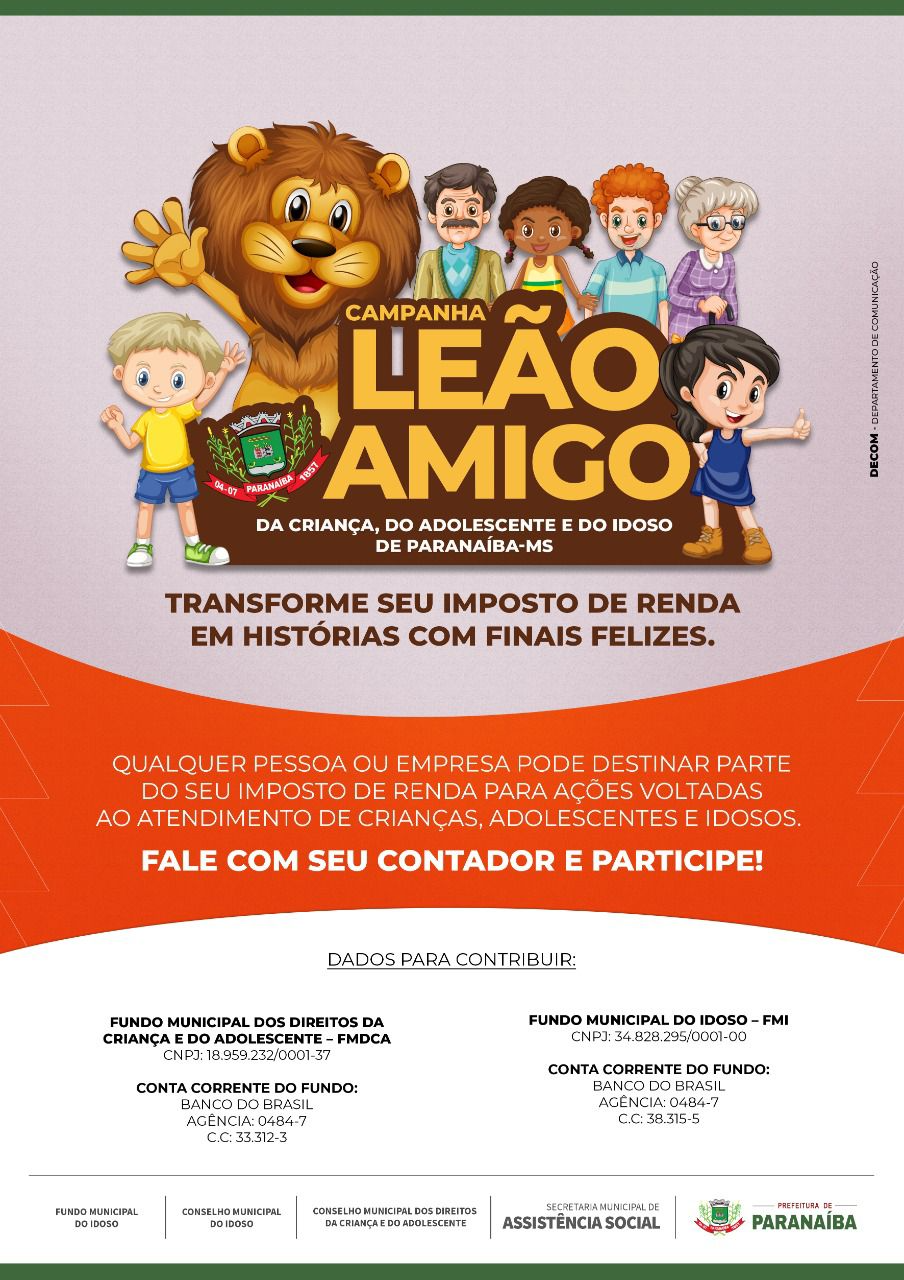 A Campanha Leão Amigo da Criança, do Adolescente e do Idoso, no município de Paranaíba, busca incentivar e orientar o contribuinte a fazer uma doação no ato da declaração do imposto de renda.