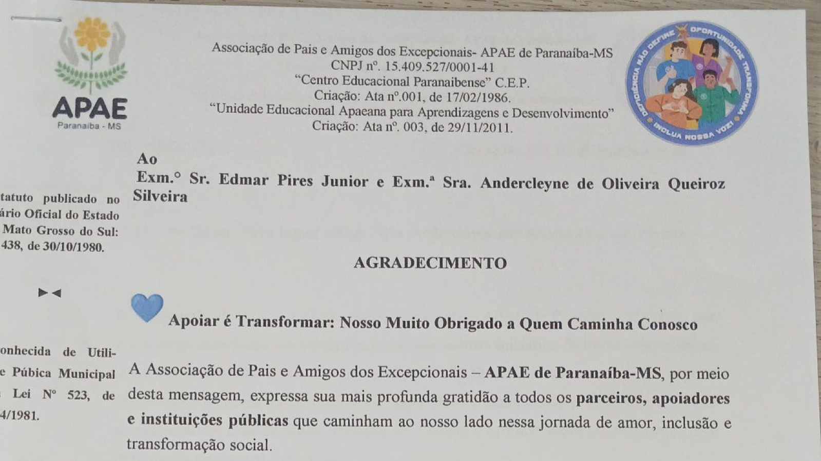 A Associação de Pais e Amigos dos Excepcionais – APAE de Paranaíba-MS vem, por meio deste, manifestar sua sincera gratidão pela valiosa iniciativa de repasse de recursos, por meio de emenda impositiva, no valor de R$ 84.120,65 (oitenta e quatro mil, cento e vinte reais e sessenta e cinco centavos), destinados à manutenção predial dos setores de atendimento na área da saúde, voltados ao cuidado e acompanhamento de pessoas com deficiência intelectual e múltipla.